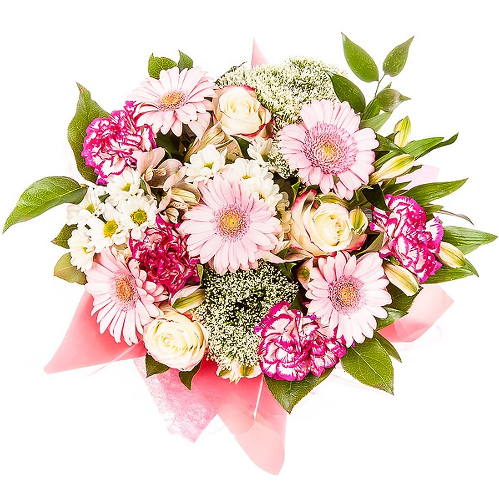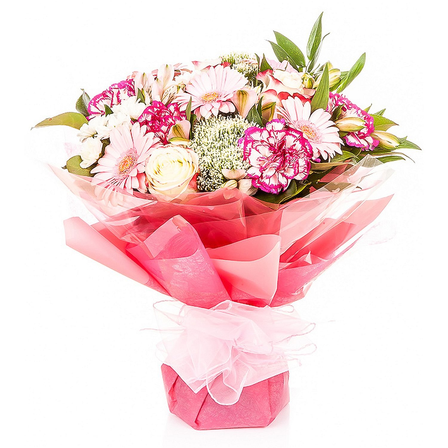 Velká 5 ks karafiát, 5 ks růže, 5 ks gerbera mini, 3 ks santini, 2 ks gypsophila, 3 ks alstromeria, manžeta, mašle a dekorativní zeleň (italský ruscus, salal)
